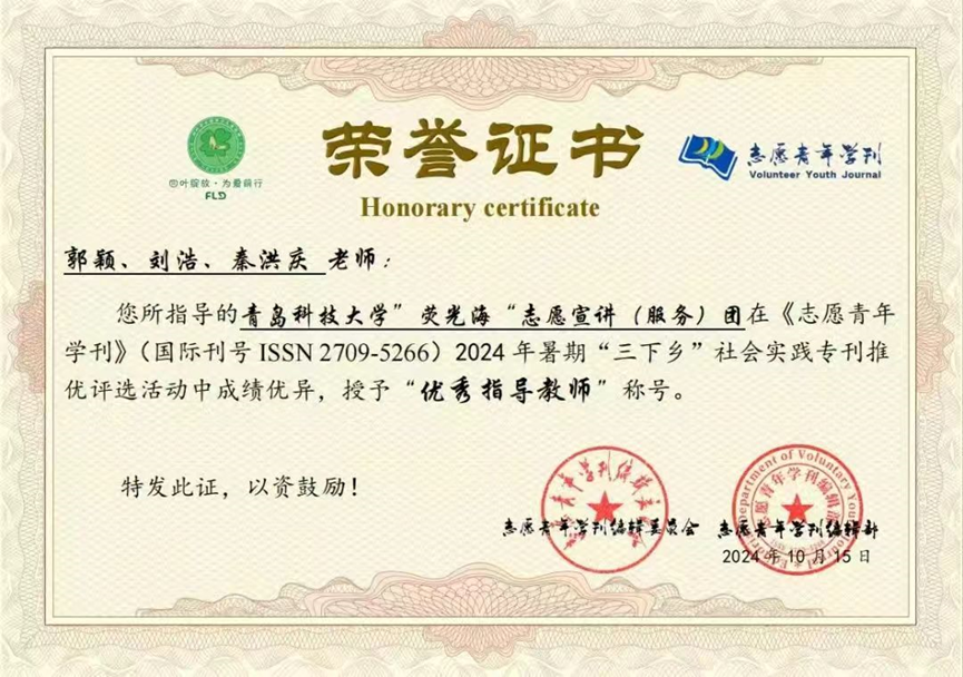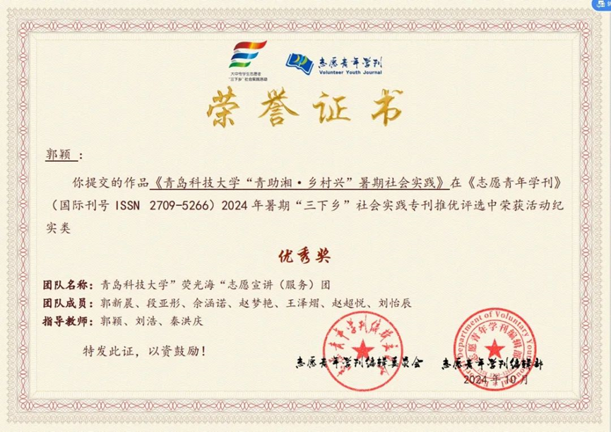 10月15日,必赢线路检测中心“荧光海”志愿宣讲(服务)团在《志愿青年学刊》(国际刊号ISSN 2709-5266)举办的2024年暑期“三下乡”社会实践专刊稿件推优评选活动中荣获优秀奖;郭颖、刘浩、秦洪庆荣获优秀指导教师。