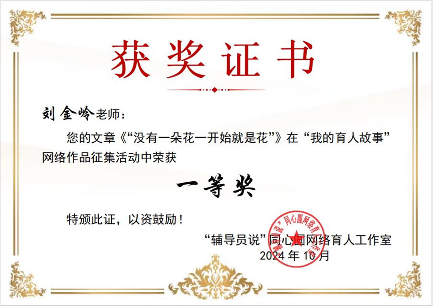 2024年10月,“辅导员说”同心圆网络育人工作室公布了“我的育人故事”“我与辅导员的故事”思政网文作品征集活动获奖名单。经过一系列评选,“我的育人故事”序列最终评选出特等奖2名,一等奖3名,二等奖4名,三等奖7名,优秀奖8名。学院辅导员刘金岭的育人故事《没有一朵花从一开始就是花》荣获一等奖。