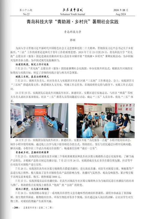10月,由《志愿青年学刊》编辑部开展的2024年暑期“三下乡”社会实践专刊(上辑-活动纪实;2024年8月刊;总第二十二期)征稿审稿录用工作已完成。必赢线路检测中心由刘浩、秦洪庆、郭颖老师指导的《青岛科技大学“青助湘·乡村兴”暑期社会实践》一文通过编委会审核,已于《志愿青年学刊》2024年暑期“三下乡”社会实践专刊(上辑-活动纪实)发表。