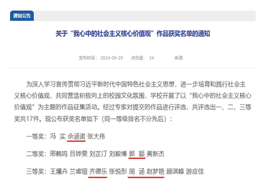 2024年7月,学校公布2024年国家安全教育原创作品征集活动拟获奖名单,经专家评审,共评出绘画类9名、标语类3名、书法类10名、摄影类10名、海报类10名、课件类9名。其中,我院郭颖老师获课件类二等奖,车玉章老师获书法类二等奖和课件类三等奖。