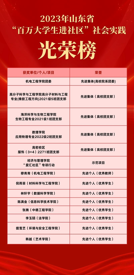 2024年3月,共青团山东省委公布2023年度“百万大学生进社区”表扬通报名单,我院生物工程专业2021级1班团支部获评省级高校团支部先进集体。据悉,本次评选共表彰全省788个先进集体,100个示范项目和950名先进个人,我校5个先进集体、1个示范项目、8名先进个人获省级“百万大学生进社区”社会实践项目表彰。