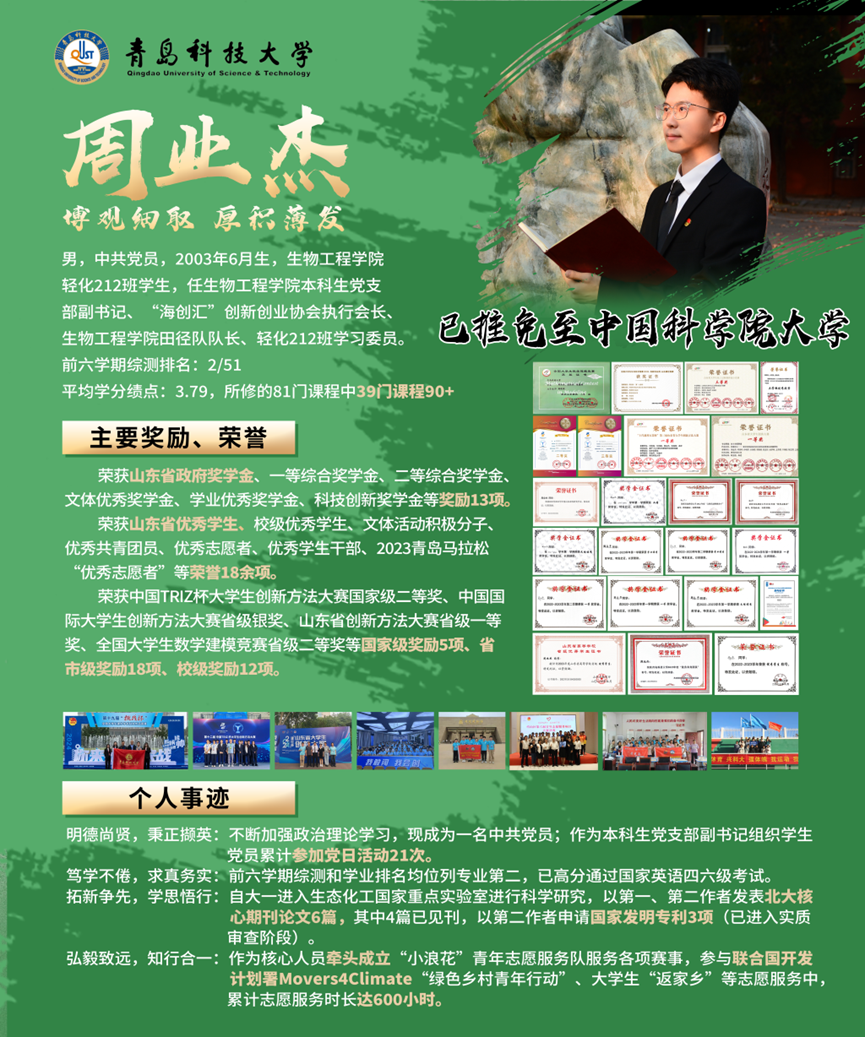 2024年,经学院(校区)推荐、资格审核、网络投票、现场汇报、民主投票等环节,必赢线路检测中心轻化212班周业杰获评青岛科技大学第十九届“十大优秀学生”。