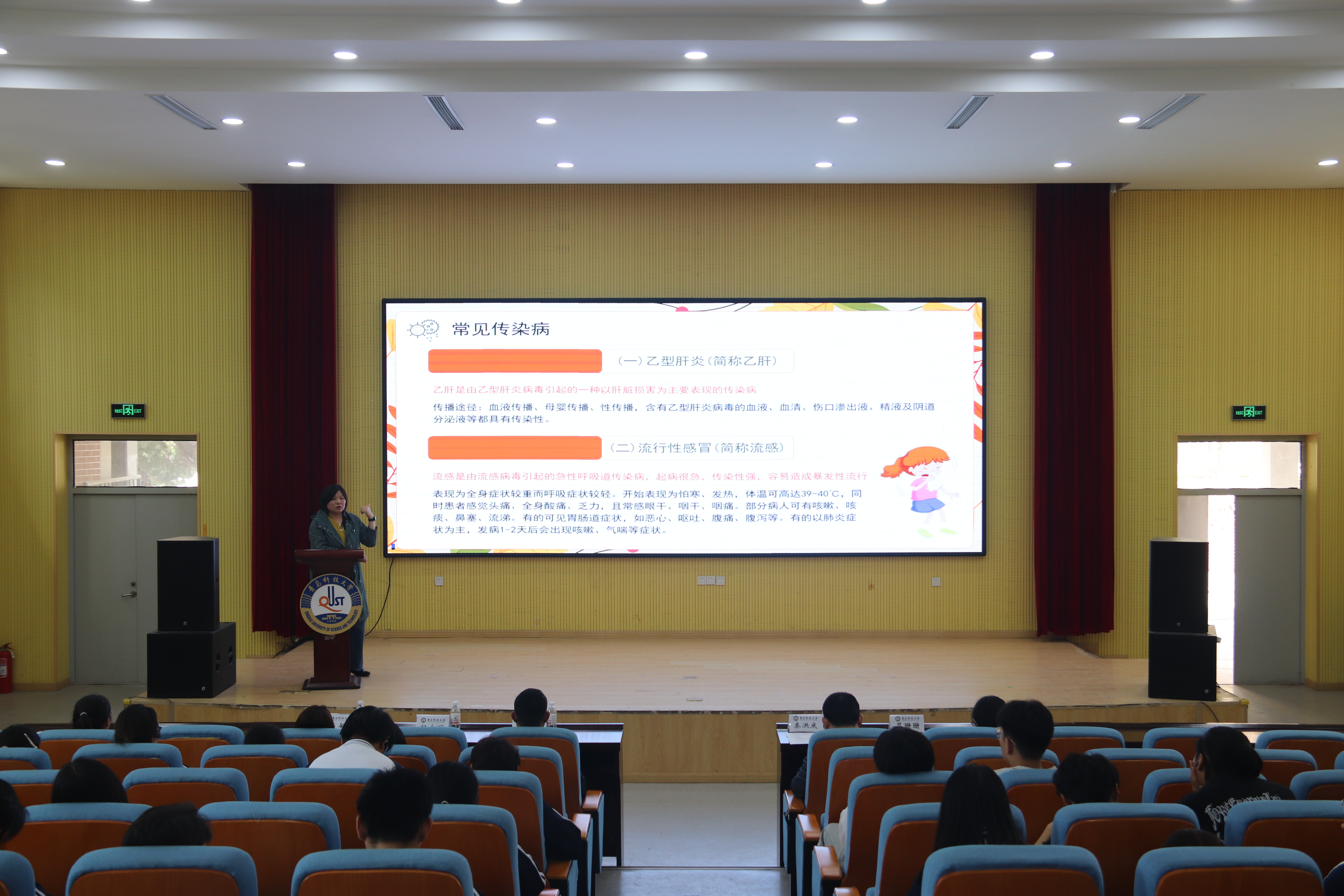 纪永丽为学生们作了《校园传染病防控与健康管理》专题讲座,系统讲解了乙肝、水痘、肺结核、流感等常见传染病的防控要点,呼吁学生重视疾病防控。