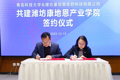 12月15日下午,青岛科技大学与潍坊康地恩生物科技有限公司共建潍坊康地恩产业学院签约仪式在蔚蓝生物创新园举行。