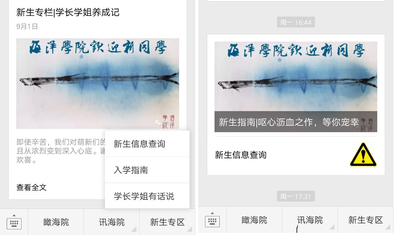 “未入校,先报到” 报到前,学院在公众号“海生汇”上率先推出新生信息查询系统,让新生在报到前就了解自己的信息。