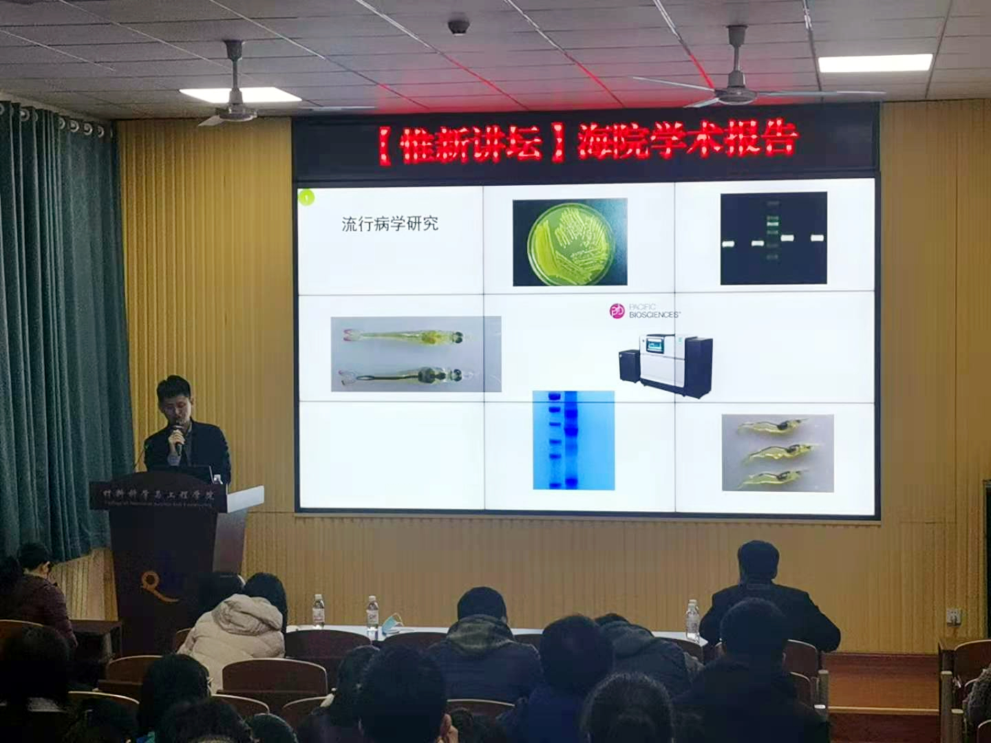 国家基金申报专题报告会后,我院在四方校区材料学院楼101报告厅召开了2场【惟新讲坛】海院学术活动月之学术报告,来自中国水产科学研究院黄海水产研究所的邵长伟研究员首先做了题为“鱼类细胞培养及半滑舌鳎性别大小异形机制研究”的学术报告,董宣副研究员做了题为“水生动物流行病学与生物安保”的学术报告,我院教师及研究生到场聆听了学术讲座。报告会结束后,与会的老师、学生与邵长伟研究员、董宣副研究员进行了深入的学术交流和讨论。