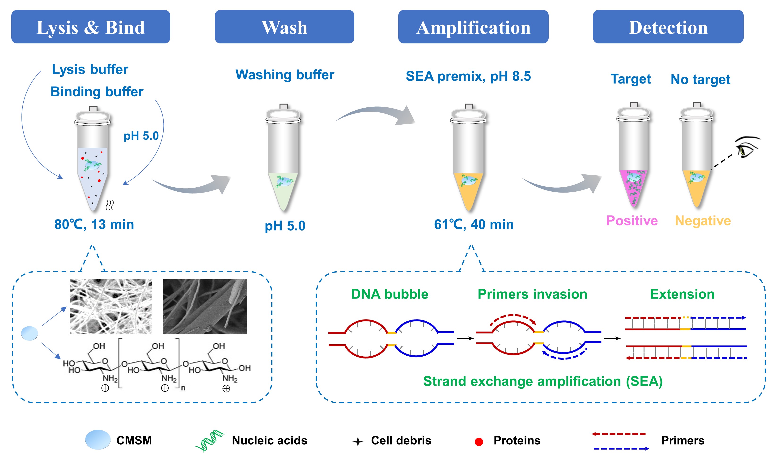 单增李斯特菌是一种重要的人畜共患食源性致病菌。该菌广泛存在于多种食品中,如肉制品、奶制品、水产品等,如何有效控制食品中的单增李斯特菌,是食品安全的重要任务,其中快速、准确的检测技术是关键手段之一。在课题组前期自主研发的基于变性泡介导的等温链交换扩增(SEA)技术的基础上,本研究报道了一种将核酸提取、扩增和可视化检测于一管中的单增李斯特菌一体化检测平台。在简单的细菌裂解后,释放的DNA和RNA被壳聚糖改性的二氧化硅膜(CMSM)提取和富集,然后将吸附核酸的CMSM直接用于后续扩增和比色检测。该平台对于纯培养单增李斯特菌的检测限为1.0×102 CFU/mL,而对于猪肉中单增李斯特菌的检测限为1.0×103 CFU/g,经过4小时增菌后检测限可以达到1.0×100 CFU/g。整个检测流程仅需一小时,其检测灵敏度达到市场检测需求。此外,研究中开发的基于比色的可视化结果判读完全省略了复杂设备的使用。因此,该平台具有在资源受限环境中快速和现场鉴定单增李斯特菌的巨大潜力。