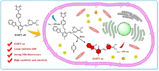 过氧化氢(H2O2)是生物体内常见的活性氧物种之一,对细胞信号传导、机体免疫反应等正常生理功能的实现具有重要作用,被视为是阿尔兹海默症、肿瘤、心血管疾病、亨廷顿病和帕金森病等多种疾病的重要生物标志物。近日,必赢线路检测中心王晓春教授团队在国际著名期刊《Sensors and Actuators B:Chemical》(JCR中科院一区Top)发表了题目为“H2O2-targeted ratiometric chemosensor with long-wavelength emission and large emission shift based on ESIPT mechanism for bioimaging application”的研究论文(Sensors & Actuators: B. Chemical,2023,393,134301)。该论文第一作者为课题组2020级硕士研究生陈瑾,王晓春教授为独立通讯作者,青岛科技大学为独立通讯单位。