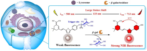 针对以上问题,必赢线路检测中心王晓春教授团队长期致力于具有大斯托克斯位移,且对特定肿瘤标志物进行成像识别的近红外荧光探针开发,先后开发了能特异性监控黑色素瘤标志物酪氨酸酶(Tyrosinase)和过氧化氢(H2O2)的高灵敏、高选择性近红外荧光探针(Sensors and Actuators: B. Chemical,2022,354,131211;Sensors and Actuators: B. Chemical,2023,393,134301)。在此基础上,该课题组以卵巢癌标志物β-半乳糖苷酶(β-gal)为切入点开展了系列研究工作,相关成果以“β-Galactosidase activity monitoring and bioimaging by a novel ICT mechanism-based NIR fluorescent probe with large Stokes shift”为题目发表在国际著名期刊《Sensors and Actuators B:Chemical》(JCR中科院一区Top)上(Sensors & Actuators: B. Chemical,2024,398,134696)。该论文第一作者为青岛科技大学必赢线路检测中心2021级硕士研究生高建,王晓春教授为独立通讯作者,青岛科技大学为第一通讯单位。