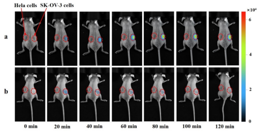 卵巢癌是威胁女性生命健康的重要疾病之一,早期的正确诊断是提高癌症治愈率的关键。已有的研究表明:β-半乳糖苷酶(β-gal)作为原发性卵巢癌的重要生物标志物,是卵巢肿瘤可视化的重要分子靶点。我们以双氰异佛尔酮衍生物CPD-OH为荧光母体,连接上半乳糖苷酶残基构建用于β-半乳糖苷酶(β-gal)识别的荧光探针分子CPD-gal。该探针母体CPD-OH具有较高的荧光量子产率(ФF = 0.31),基于ICT机理构建的探针CPD-gal本身荧光淬灭,与β-半乳糖苷酶作用后,显示出明显的荧光增强效应。该探针具有近红外发射(lem = 713 nm)、抗干扰能力强、灵敏度高(LOD = 6.0 ×10-4 U/mL)、斯托克斯位移大(133 nm)和细胞毒性低等优点。利用该探针,我们成功实现了活体细胞(Hela cells 和SK-OV-3 cells)和小鼠体内的内源性或外源性β-半乳糖苷酶的高分辨活体成像,为卵巢癌等疾病的早期诊断提供了有效手段。
