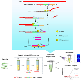 病原体的准确检测对于临床诊断和生物医学研究具有重大的意义,基于DNA检测聚合酶链式反应(Polymerase chain reaction, PCR)技术作为病原体检测的金标准,具有高灵敏、高特异性的优点,但存在无法区分病原体生存状态的问题;相比之下,RNA具有半衰期短、丰度高的特点,基于RNA的检测可以选择性地检出具有转录活性的病原体。针对病原菌的高灵敏、快速检测问题,马翠萍教授团队构建出一种新型等温RNA检测技术,该技术基于DNA/RNA嵌合探针触发指数扩增反应,检测结果可以通过便携式紫外灯即可进行判读,且无需精密的温度控制装置(图1)。另外,该技术可以实现靶标RNA区域的短期保护,即使在RNA酶存在的条件下,该技术至少可以保证36小时内RNA不会发生降解,避免了由于靶标降解造成的假阴性问题。该平台对于大肠杆菌RNA的检测限为1 fg/μL, 对于牛奶中大肠杆菌的检测限为1.0×102 CFU/mL,检测过程40分钟之内即可完成,不依赖于复杂的检测设备,有望成为临床诊断和食品安全检测领域强有力的RNA检测工具。