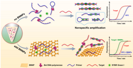 此外,以DNA扩增为基础的核酸检测已广泛用于分子诊断、食品安全监测和传染病预防。然而,引物二聚体的形成、发夹结构和错配杂交导致的非特异性扩增严重限制核酸检测技术的实际应用。因此,迫切需要探索一种提高核酸检测的特异性和灵敏度的方法。马翠萍教授团队证明了纳米材料氮化硼纳米片(Boron Nitride Nanoplate, BNNP),由于其独特的表面性质,可以与扩增反应的主要组分,如单链引物和Bst DNA聚合酶相互作用,并提高溶液的导热性,BNNP的存在显著提高了PCR和环介导等温扩增(Loop-mediated isothermal Amplification, LAMP)的特异性(图2)。此外,BNNP还提高了LAMP的灵敏度,并且基于BNNP的LAMP的检出限比传统LAMP低两个数量级,同时此方法被证实可用于海产品中副溶血性弧菌的检测。这是首次系统地证明BNNP可以提高PCR和LAMP扩增反应的效率和准确度,从而极大地扩展了核酸检测在实验室和现场环境中的应用。