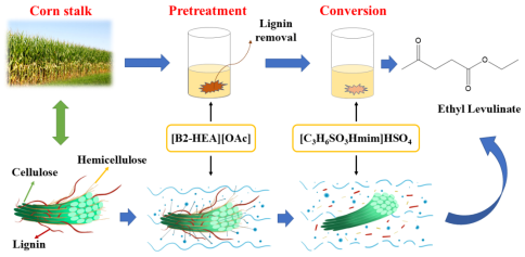 来自农作物秸秆的木质生物质是一种丰富且廉价的可再生资源,可以转化为高价值的平台化学品。木质生物质拥有复杂的三维结构,其主要组分纤维素、半纤维素和木质素之间通过氢键和共价键牢固地相互结合,因此木质生物质通常都不容易被降解,需要一系列有针对性的预处理。质子型离子液体是一种结构稳定、酸性可调且可循环使用的新型催化剂,具有优异的溶解纤维素的能力,通过降低纤维素的结晶度,进一步增强其水解/醇解性。