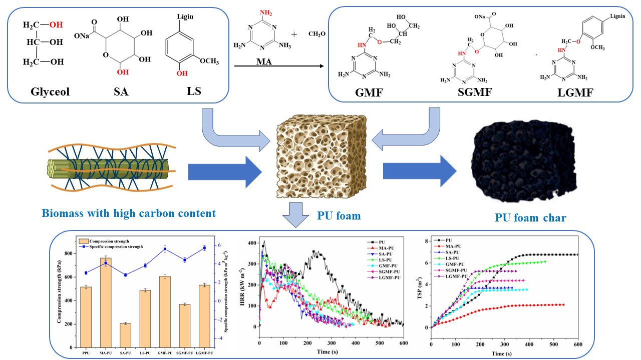 图1. 改性三聚氰胺甲醛树脂和相关聚氨酯泡沫的制备及阻燃特性