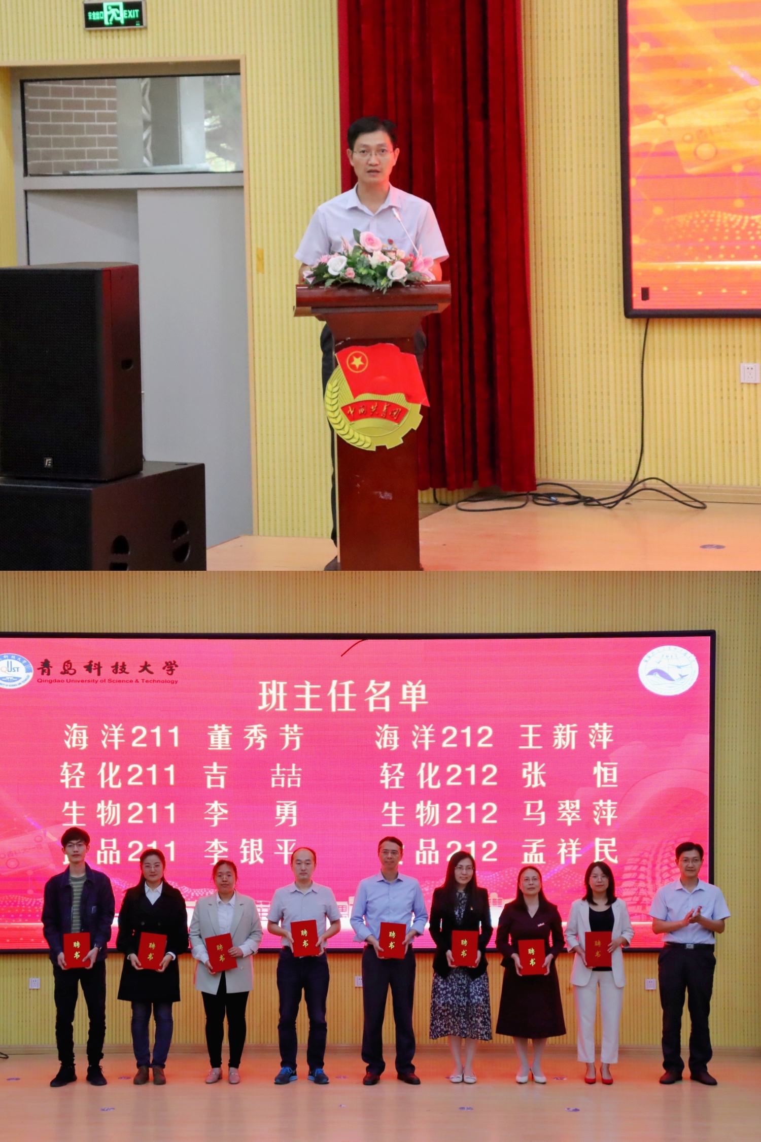 党总支书记周宪锋为2021级班主任颁发聘书及工作手册,宣读表彰“最美海洋人”相关文件。