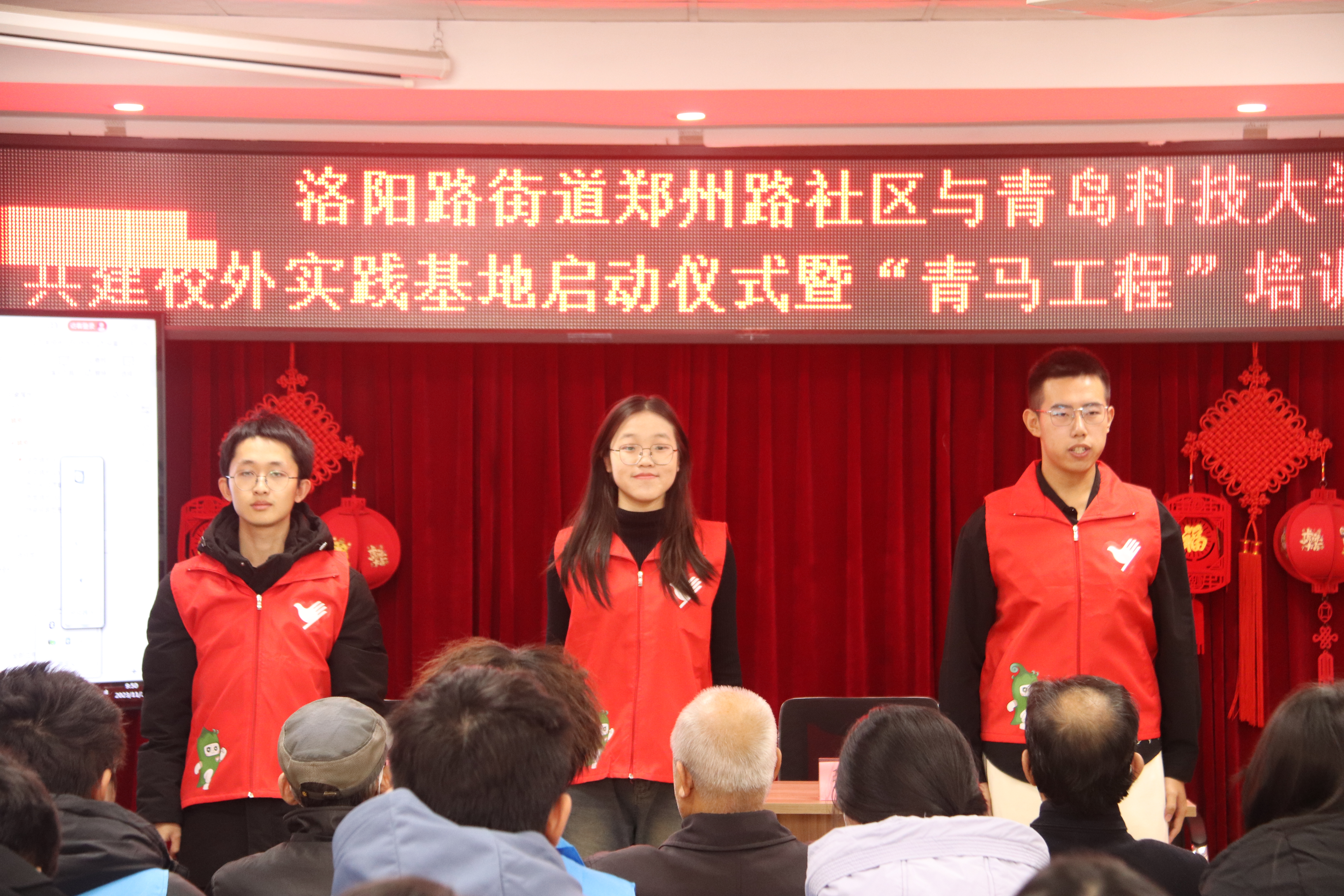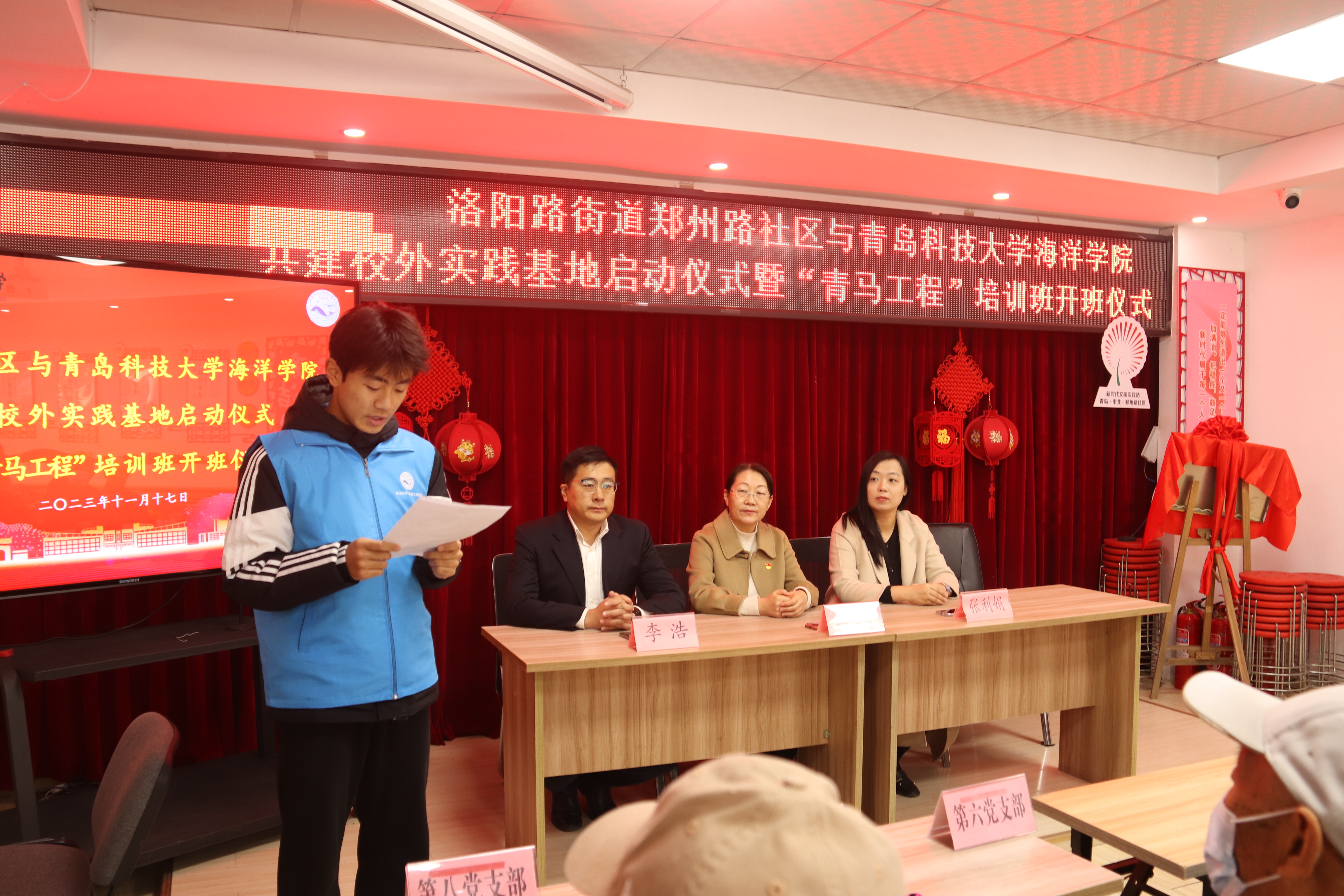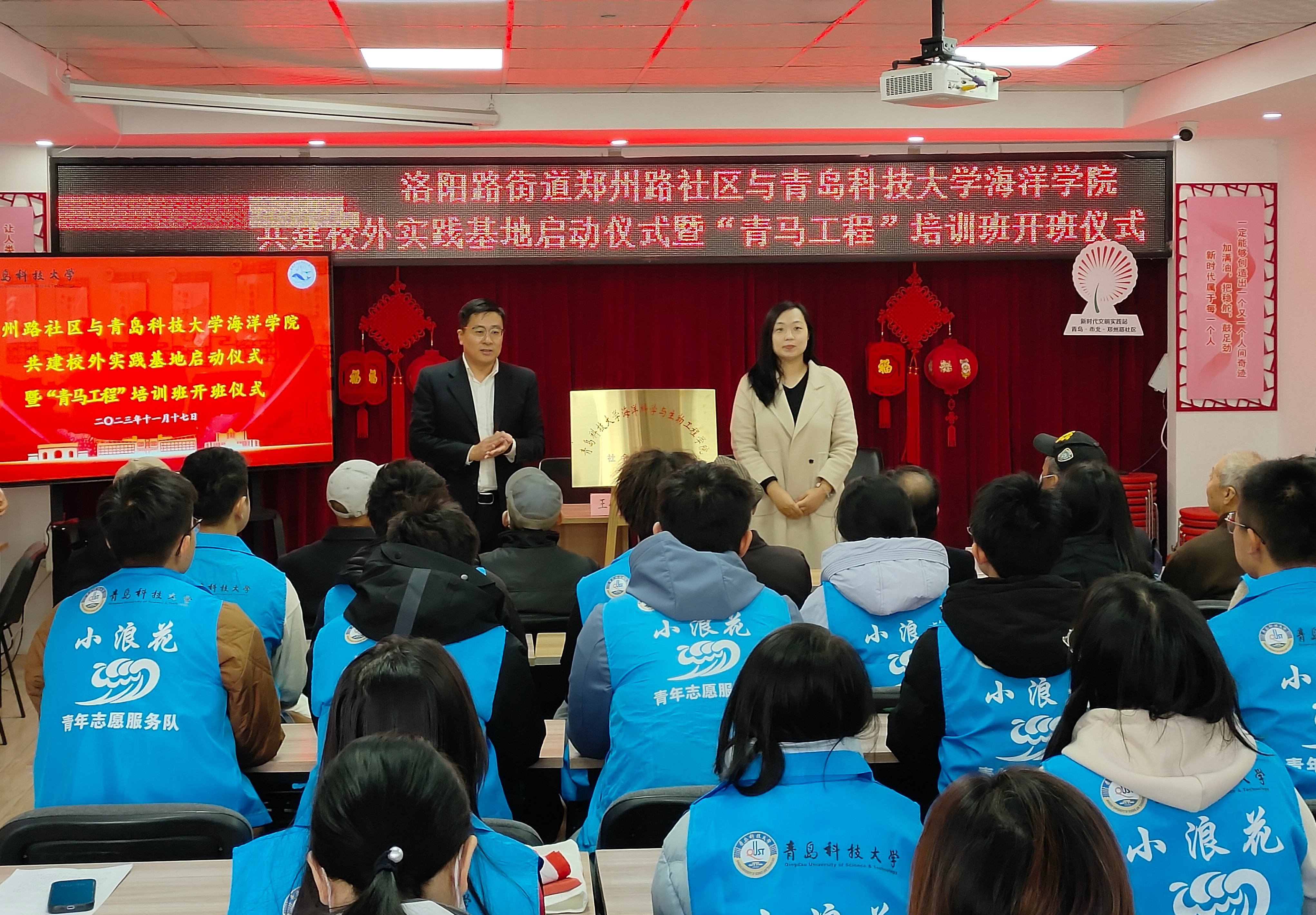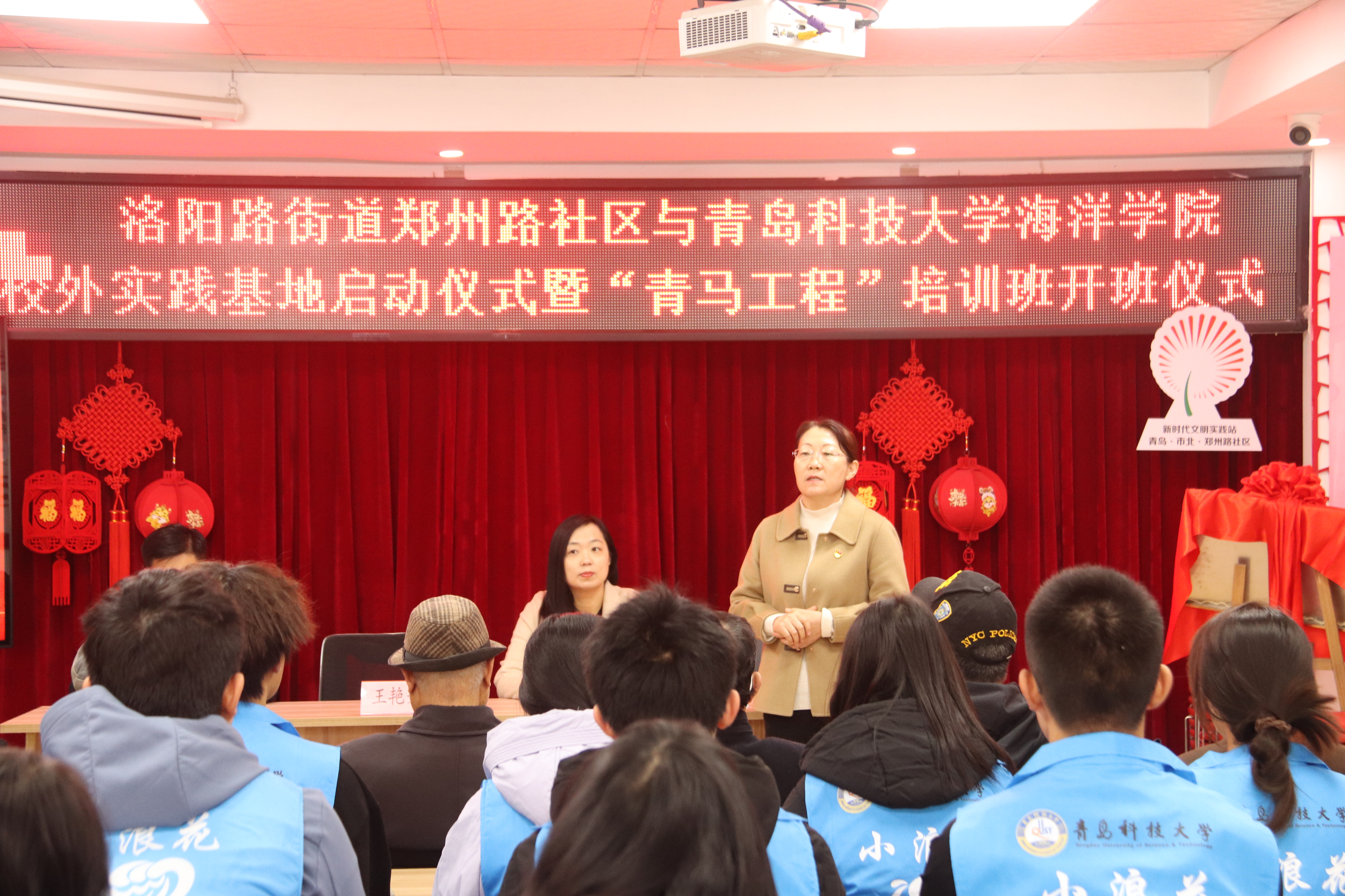为全面落实习近平总书记关于青年工作的重要思想,进一步推进学院“青马工程”建设,引导广大青年学子在基层实践中受教育、长才干、做贡献,实现青年人才发展与基层治理创新齐头并进,11月17日,我院2023年秋季“青马工程”培训班开班仪式暨校外实践基地启动仪式在洛阳路街道郑州路社区举办。洛阳路街道办事处副主任张利娟、我院团委书记李浩、郑州路社区党委书记王艳芳出席活动,我院青马学员、郑州路社区网格长和党员群众代表30余人参加活动。