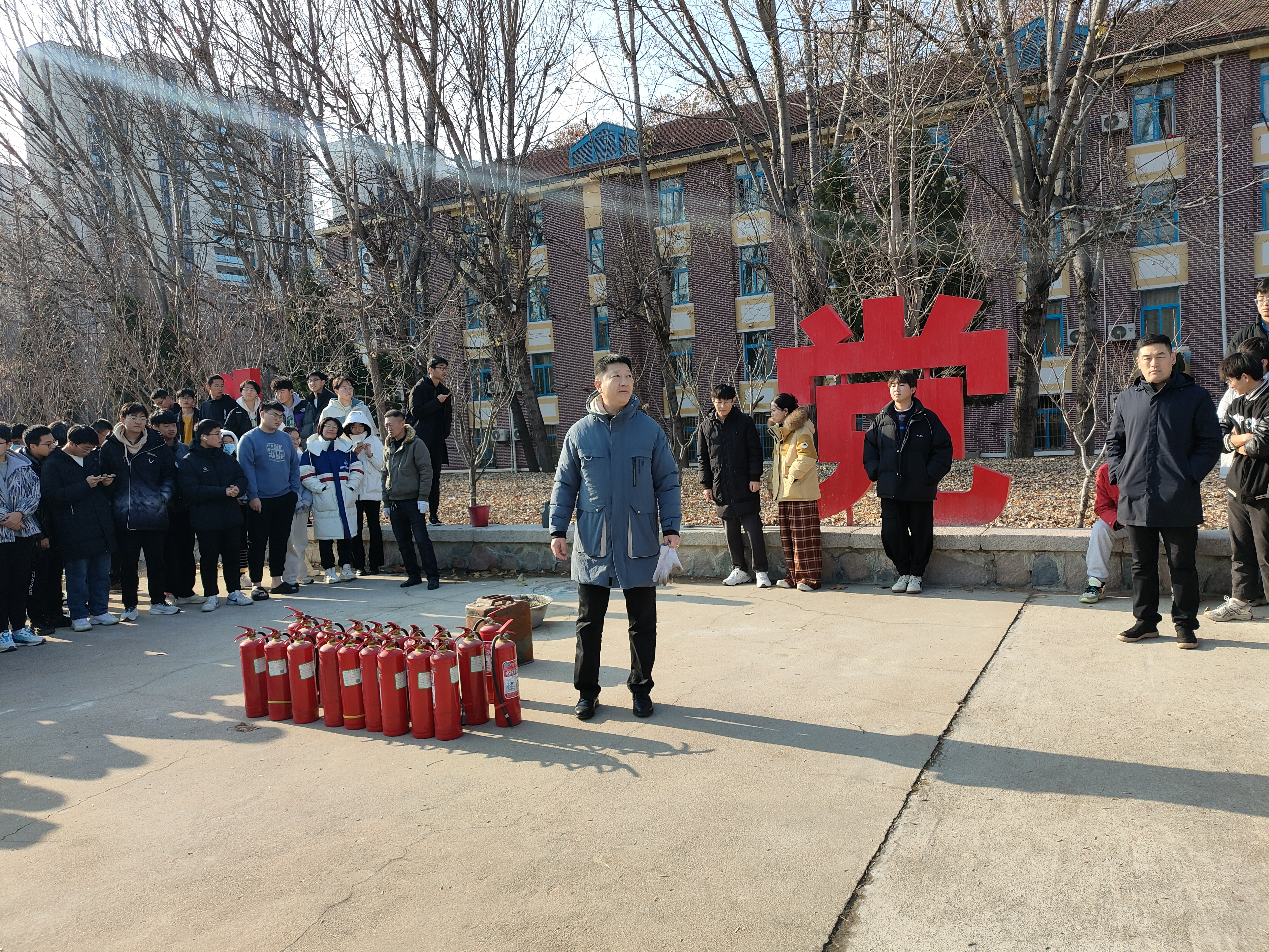 仇立峰结合大学生活的具体情况,从生活中的火灾隐患、如何正确使用灭火器、火灾发生时的逃生自救等方面进行现场消防知识的教学。