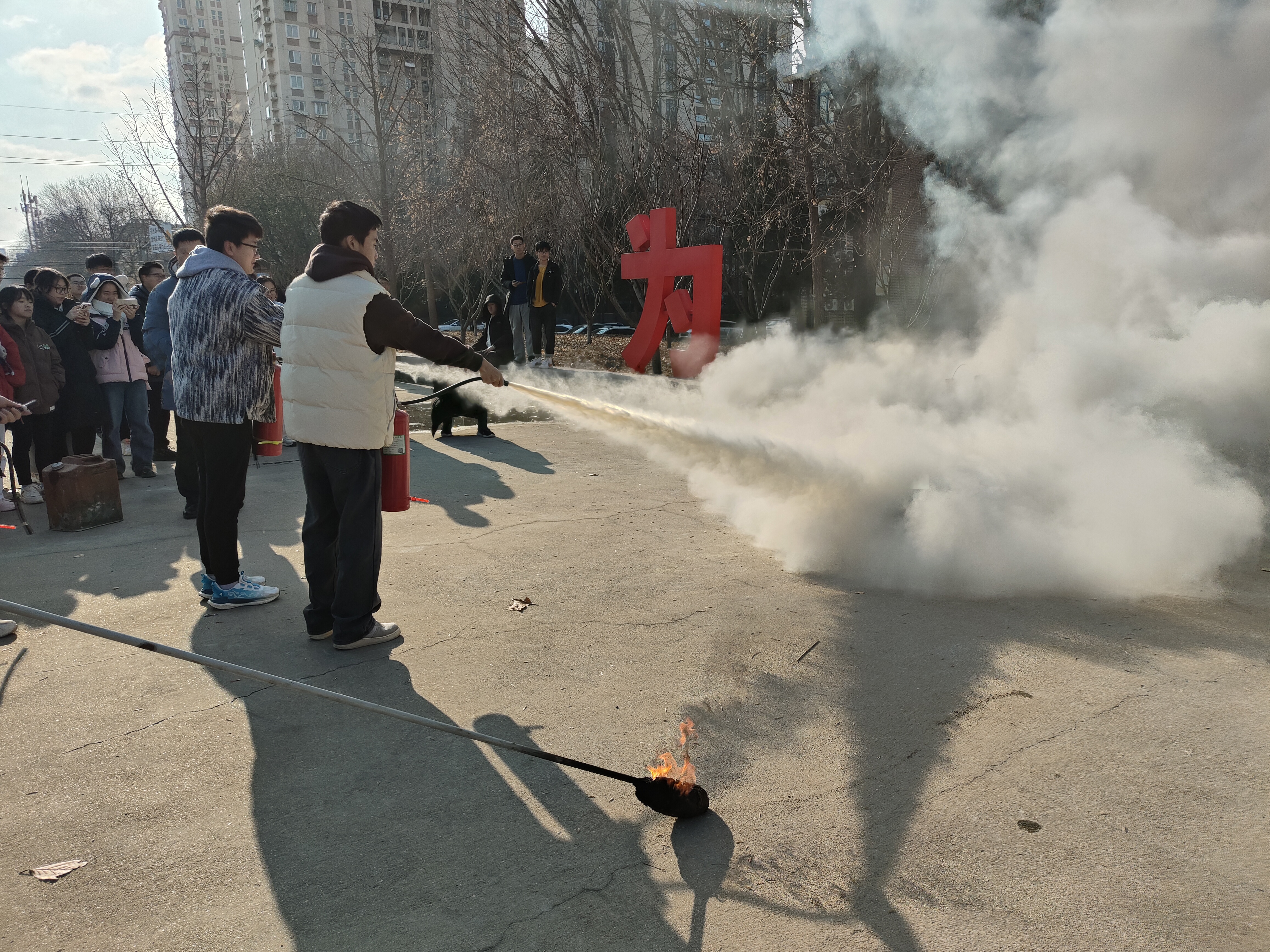 教学讲解结束后,同学们在老师的指导下轮流拿起干粉灭火器,在实践中检验所学理论,切实提高了同学们使用灭火器扑救初期火情的能力。