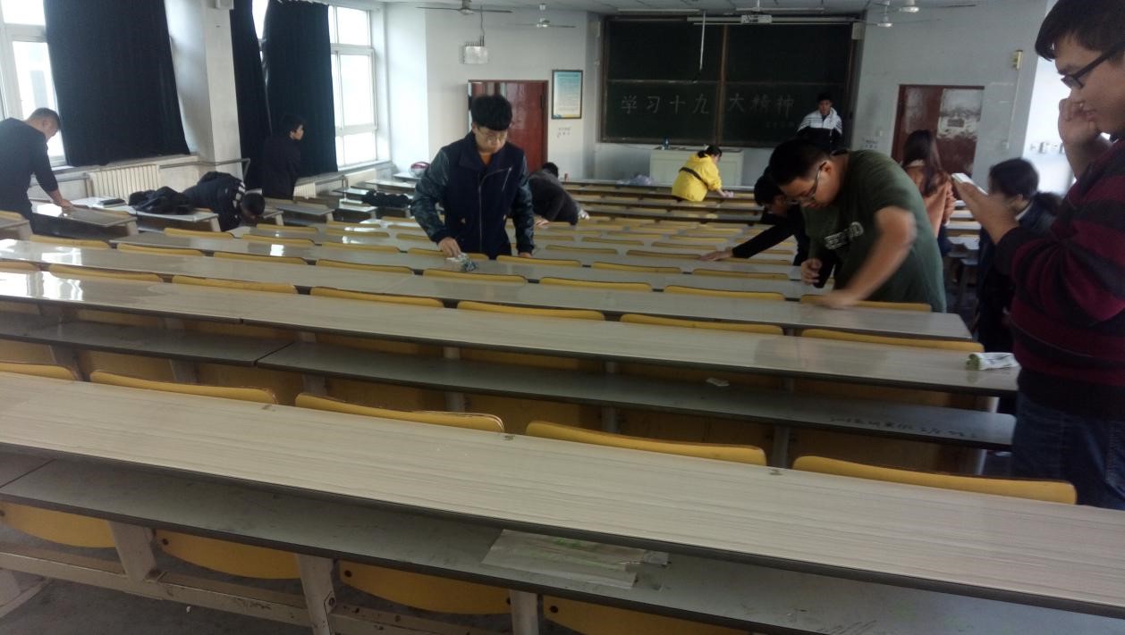 为了响应十九大系列重要讲话精神,营造干净、整洁的学习氛围,凝聚班级同学的向心力。11月14日下午1:30,海洋科学162班在班委的带领下认真打扫了一教301,同学们以饱满的热情高效率、高质量的完成了清洁工作。