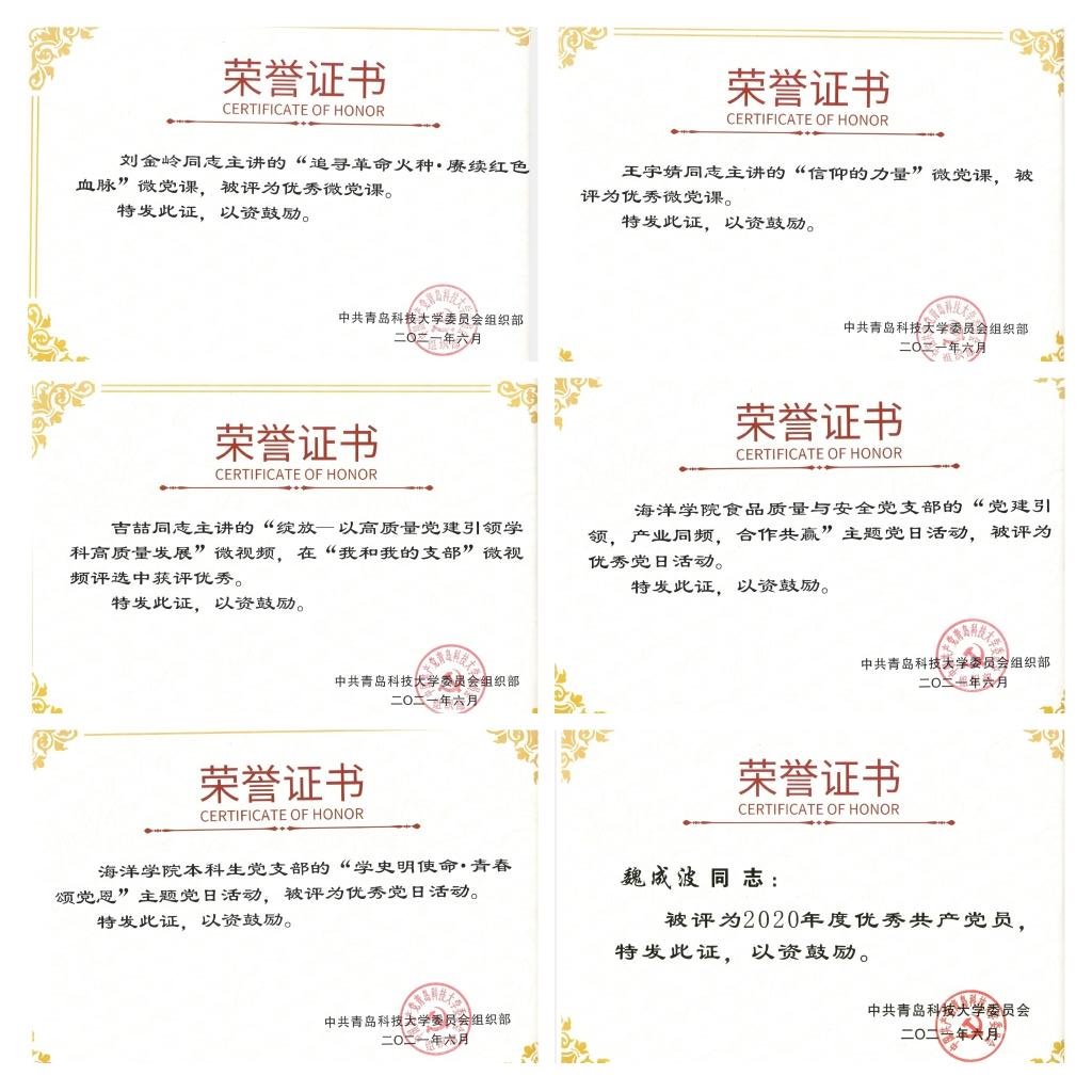 学院本科生党支部书记刘金岭主讲的“追寻革命火种,赓续红色血脉”微党课、海洋科学党支部王宇婧主讲的“信仰的力量”微党课获评校“优秀微党课”,轻化工程党支部书记吉喆主讲的“绽放-以高质量党建引领学科高质量发展”微视频在“我和我的支部”微视频评选中获评优秀,食品质量与安全党支部的“党建引领、产业同频、合作共赢”主题党日活动、本科生党支部“学史明使命,青春颂党恩”主题活动获评校“优秀党日活动”,海洋科学专业学生魏成波党获评校“2020年度优秀共产党员”。