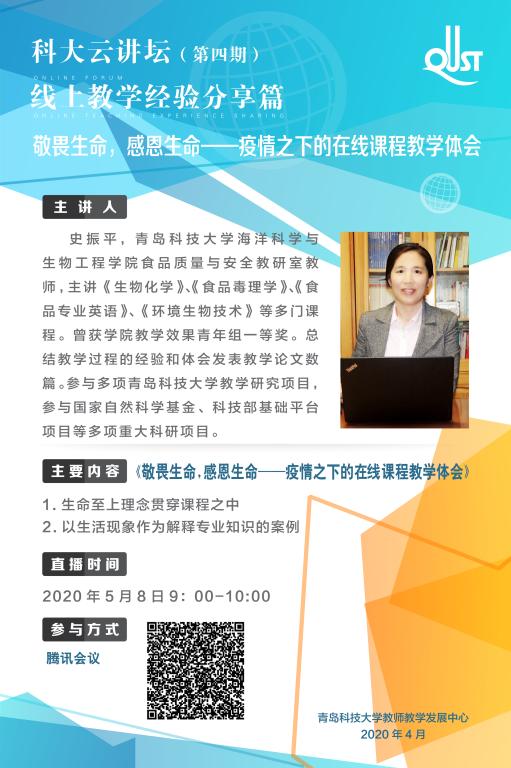 2020年5月8日上午9时,我院教师史振平在第“四期科大云讲坛”开展“敬畏生命,感恩生命——疫情之下的在线课程教学体会”经验交流。史老师从“在课程过程中贯穿生命至上理念、以生活现象作为解释专业知识的案例、学生在课堂和课下交流及反馈情况”三个方面进行了总结和交流。