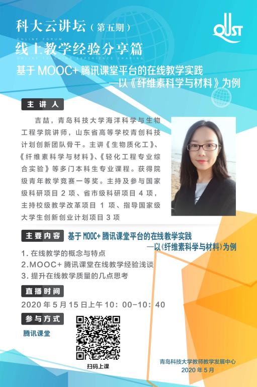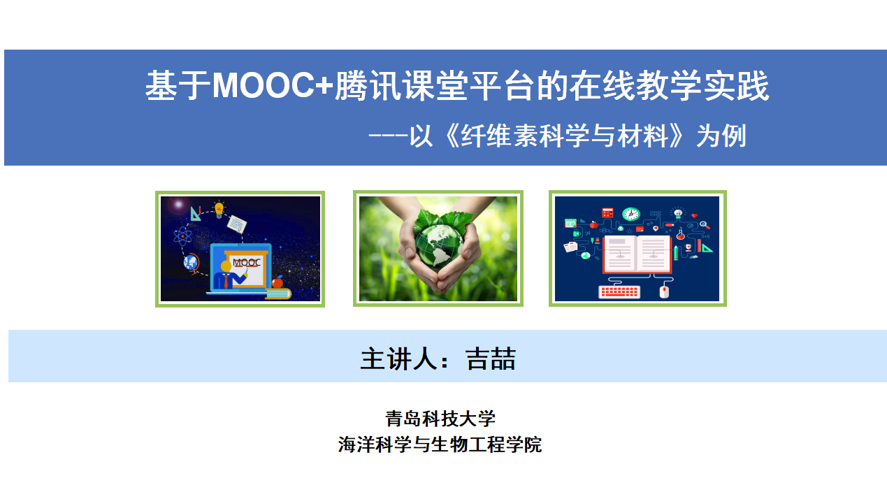 2020年5月15日上午10时,我院教师吉喆在第五期科大云讲坛举行了“基于MOOC+腾讯课堂平台的在线教学实践---以《纤维素科学与材料》为例”的经验交流活动。吉老师充分分析了在线教学的特点及优势,结合讲授的专业课程,对在线教学的思路设计做了充分讲解,并针对“如何利用现有的MOOC和腾讯课堂直播平台,开展生动有趣的在线教学”做了详细汇报。最后,吉老师结合个人教学经验,对提升线上教学质量的策略进行了总结和交流。
