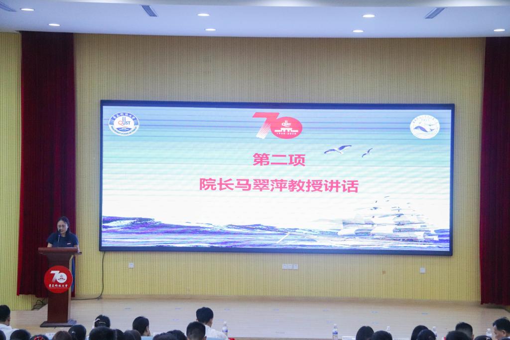 马翠萍代表全体教师和高年级同学,对2020级新生选择青科大、选择我院表示热烈欢迎,并介绍了学院2017年成立以来在人才培养、科学研究等方面取得的成绩。